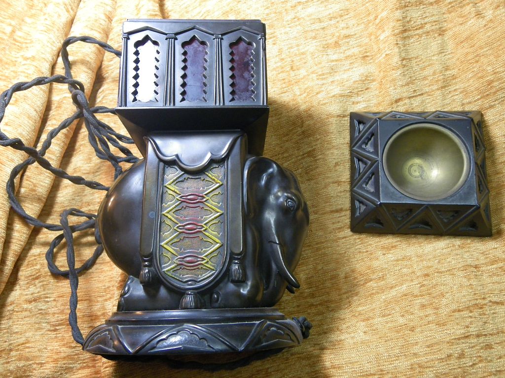 Preciosa lámpara con figura de elefante estilo modernista, de 25 cm. de alto, en metal, original de época, años 20-30, electrificada, con cable también original y bombilla interior que luce en color rojo, con cenicero en parte superior.