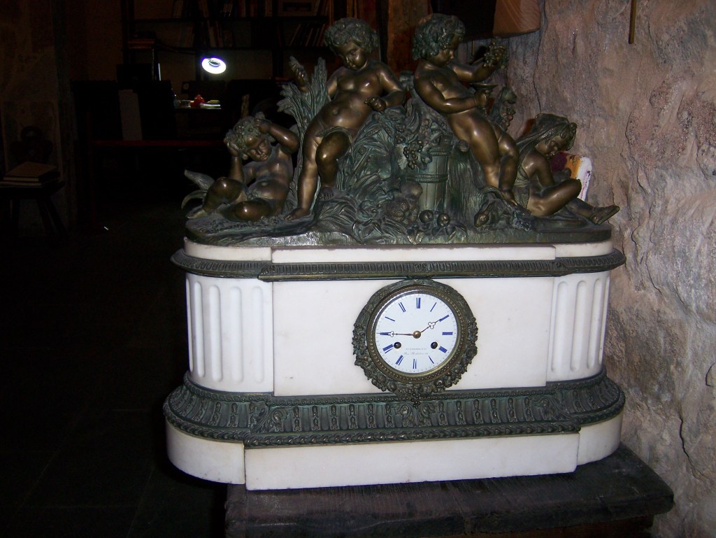 Importante reloj de sobremesa francés, siglo XIX, maquinaria de ´epoca original, con diferentes sellos y troqueles, medalla de oro, en perfecto estado de marcha; base en marmol blanco y en parte superior angelitos en bronce, patinado, firmado por Quesnel.