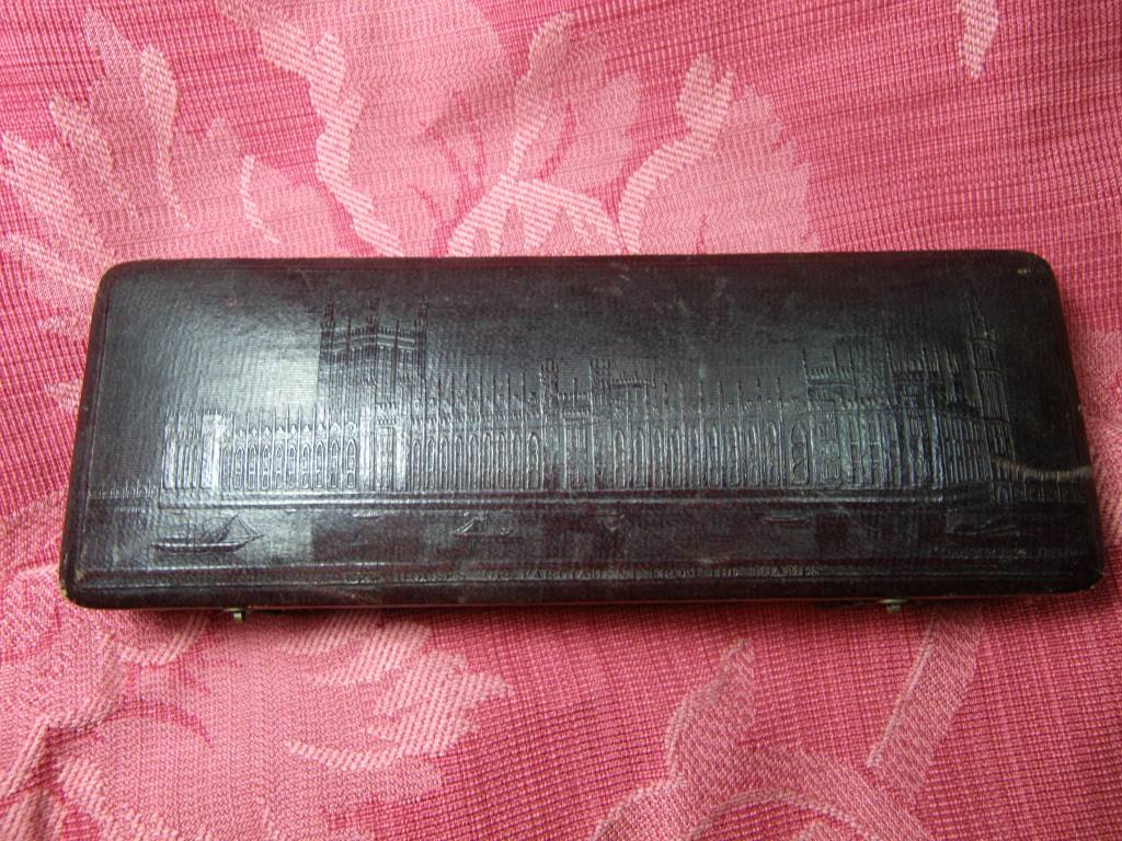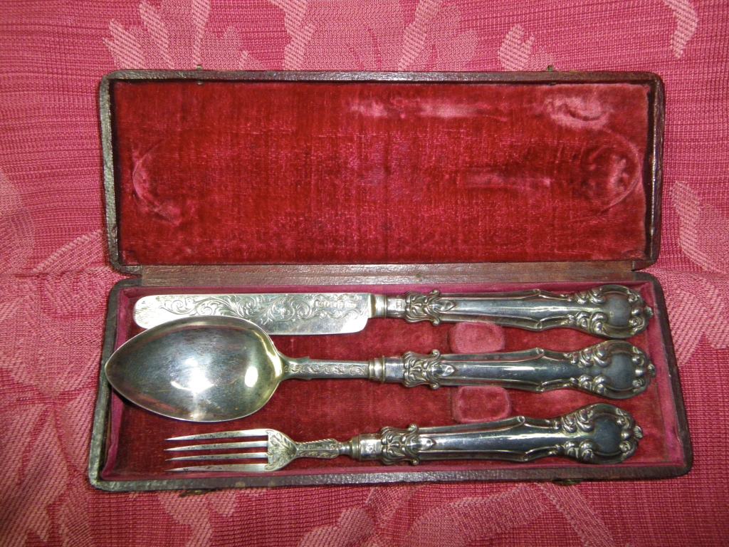 Preciosa pareja de candeleros de SEVRES, con marcas. Estuche en cuero conteniendo cubiertos en plata inglesa conmemorativo del Parlamento Británico, con diversos sellos de la plata en los cubiertos; perfecto estado; precioso.